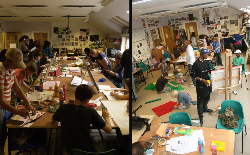 As it was residential, feeding and housing were paramount. This worked best the year we serendipitously attracted the participation of a fine arts graduate who also happened to be a chef. Otherwise, it was all hands on deck. Breakfast was usually self-service, lunch was a buffet with soup and salad tabled on a rolling service between 1230 and 2pm, and dinner was a mammoth operation. Artists ranging in age from 6 to the over 60s creating together and alongside one and other in the studio by day, then cooking and eating together, peeling off in the evening to take walks, return to the studio, share their work and inspirations, music, poetry, or politics deep in discussion or solitary contemplation all the while. It was almost utopian. The residential summer school participants were joined by local children, some as young as 4 or 5 who flooded in and out of the studio like a tide for short periods every day.
